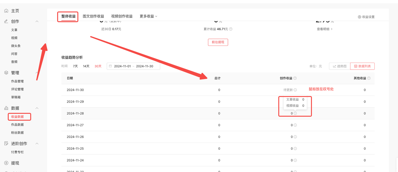 当收益金额≥0.01元时,登录头条号后台,点击“数据 - 收益数据 - 整体收益”页面查看收益数据。
